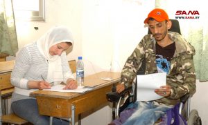 وخلال مواكبة سانا للجرحى في اليوم الأول من الامتحانات في مركز مدرسة الشهيد سلمان دويعر بمدينة السويداء قال الجريح إيهاب العزمي الذي فقد بصره نتيجة تفجير بمنطقة خان الشيح خلال أدائه واجبه الوطني: “إن نجاحي العام الماضي في شهادة التعليم الاساسي أعطاني دافعاً هذا العام لمواصلة الدراسة في التعليم الثانوي وتحقيق طموحي للتسجيل في كلية الحقوق” مؤكداً أهمية أن يتابع الجرحى ميدان دراستهم العلمية لإحداث تغيير في حياتهم نحو الأفضل ليتسلحوا بالعلم ويشاركوا ببناء المستقبل بعد أن حملوا السلاح في ميدان الدفاع عن الوطن.