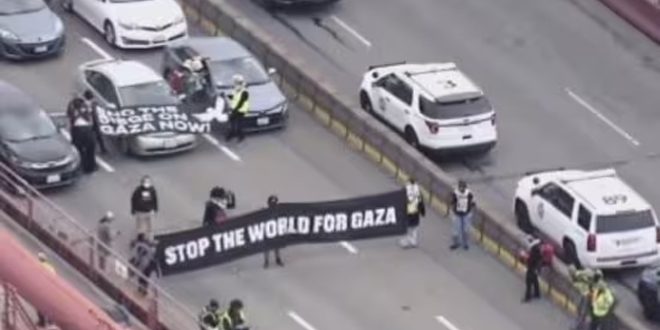 أغلق متظاهرون اليوم جسر غولدن غايت الذي يعتبر أحد معالم مدينة سان فرانسيسكو في ولاية كاليفورنيا الأمريكية تأييداً للفلسطينيين واحتجاجاً على العدوان الإسرائيلي المتواصل على قطاع غزة.