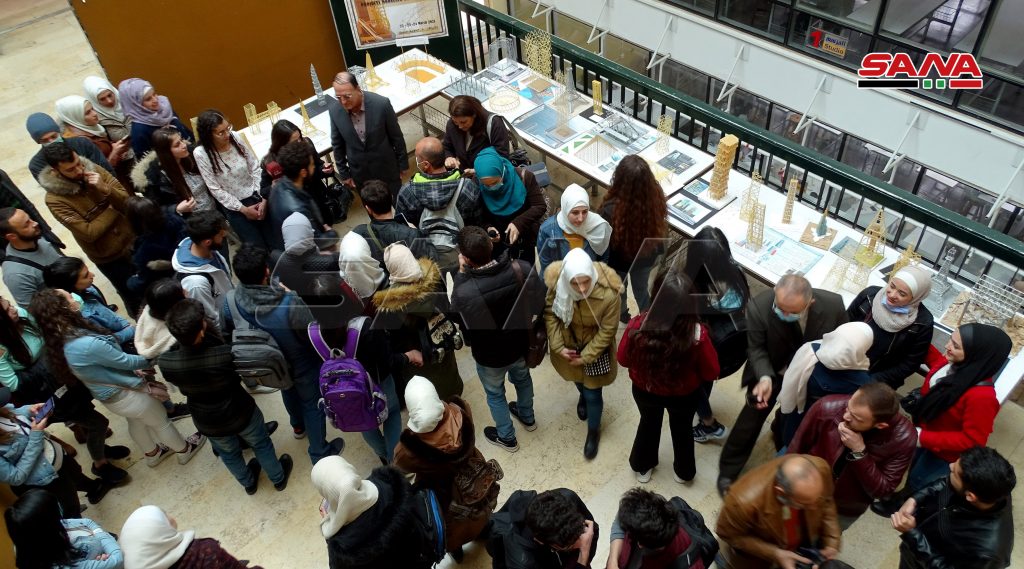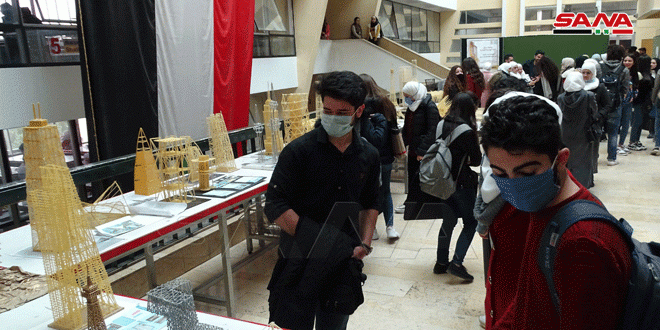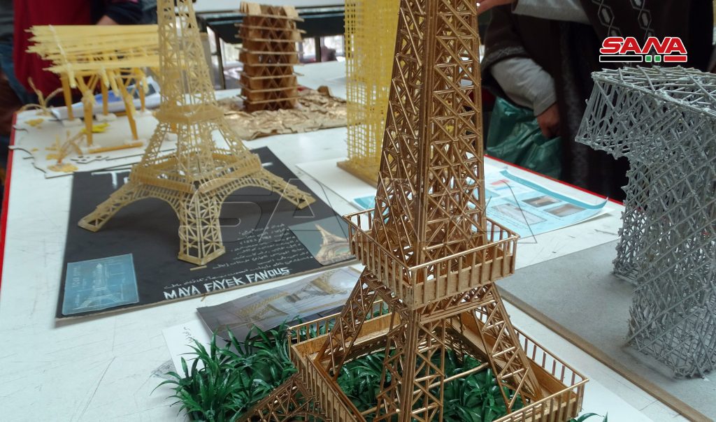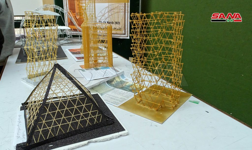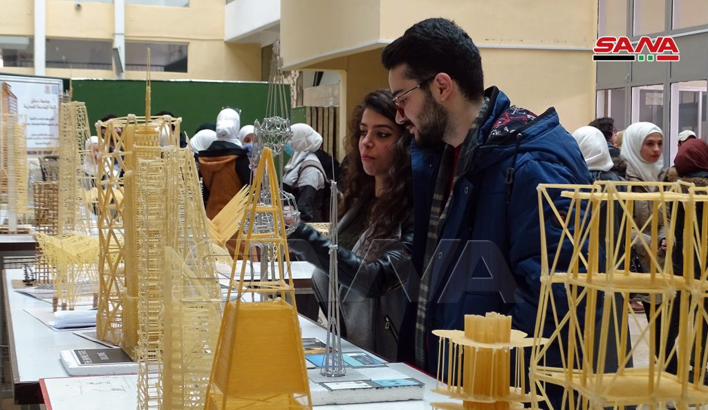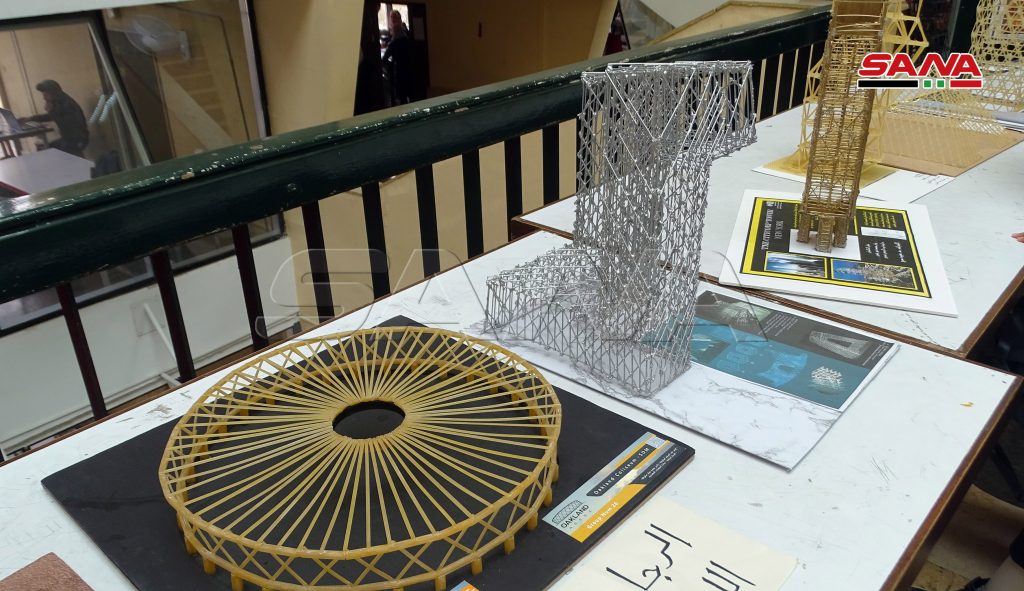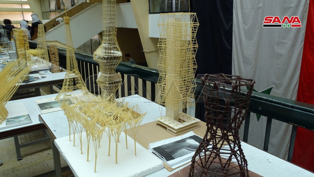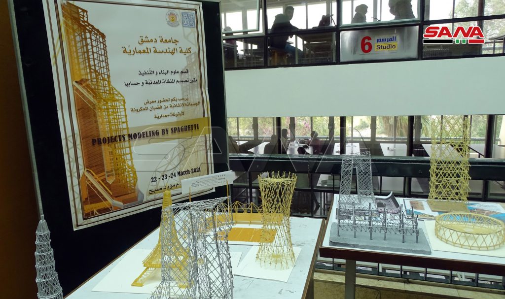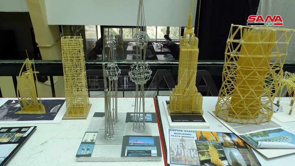 بقضبان المعكرونة نفذ طلاب السنة الرابعة في كلية الهندسة المعمارية بجامعة دمشق قسم -علوم البناء والتنفيذ- نحو 220 مجسما إنشائيا لمعالم معمارية احتضنها اليوم معرض في الكلية.
