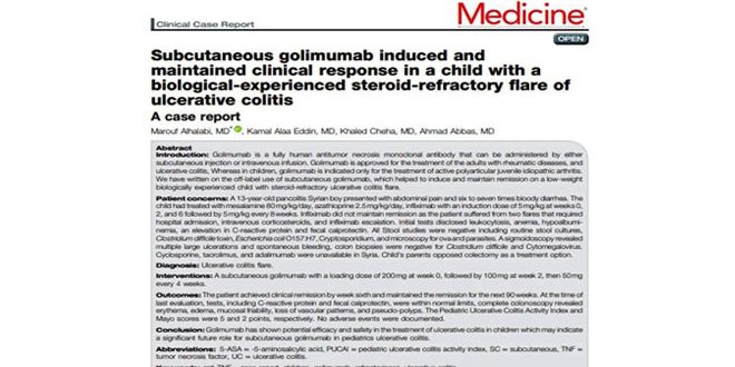 نشرت مجلة (ميدسين) حالة وثقتها الهيئة العامة لمشفى دمشق نجحت فيها بعلاج طفل 13 عاماً يعاني من التهاب قولون تقرحي شديد عبر علاج بيولوجي يستخدم عادة للبالغين.