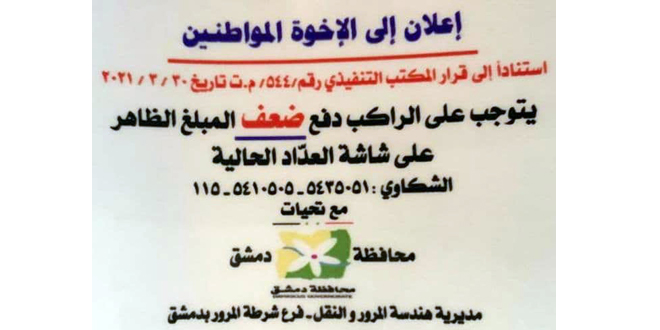 وبين مدير هندسة المرور والنقل بمحافظة دمشق المهندس ياسر بستوني في تصريح لمندوب سانا أن اللصاقة مكتوب عليها ما يجب على الراكب دفع ضعف المبلغ الظاهر على شاشة العداد الحالية وتتضمن أرقام شكاوى فرع المرور مشيراً إلى وجوب وضع اللصاقة على الزجاج الأمامي للسيارة بشكل ظاهر ومقروء للركاب.