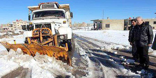 تفقد محافظ السويداء عامر ابراهيم العشي اليوم عمليات فتح الطرقات التي أغلقتها الثلوج في قرى المنطقة الشرقية الجبلية جراء العاصفة التي تأثرت بها البلاد.