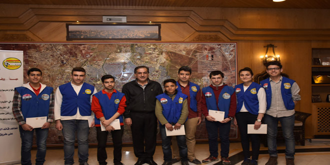 كرم محافظ حلب حسين دياب اليوم الطلاب الأوائل في الأولمبياد العلمي السوري من المحافظة الذين سيشاركون في الاختبارات الدولية للأولمبياد العلمي للعام الحالي.