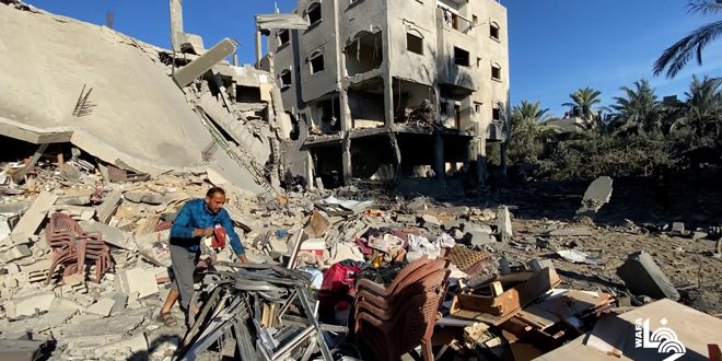 شادي قاسم الذي يقيم حالياً في مركز إيواء تابع للأونروا في دير البلح يقول لمراسل سانا: الاحتلال يستخدم سياسة الأرض المحروقة في عدوانه على مخيمات وسط القطاع، وقام بتهجير معظم أهلها بعد أن هدم أحياء سكنية كاملة فيها، مبيناً أن نحو 600 ألف نازح وصلوا من مخيمات وسط القطاع وشماله إلى مدينة دير البلح، التي تتعرض لقصف متواصل جواً وبراً وبحراً، وعلى الرغم من كثافة القصف يواصل أهالي المخيمات صمودهم وثباتهم في وجه الاحتلال الذي قطع عنهم أيضاً إمدادات الغذاء والدواء والمياه ودمر البنية التحتية.