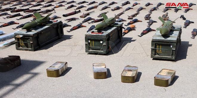 ضبطت الجهات المختصة بالتعاون مع الأهالي اليوم كميات كبيرة من الأسلحة والذخائر بعضها أمريكي الصنع من مخلفات الإرهابيين خلال استكمال أعمال تأمين ريف درعا الغربي.
