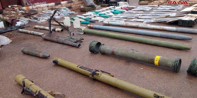 عثرت الجهات المختصة خلال تمشيط المناطق المطهرة من الإرهاب في مزارع منطقة درعا البلد على طائرة استطلاع مسيرة وأسلحة وقذائف بعضها غربية المنشأ من مخلفات التنظيمات الإرهابية.