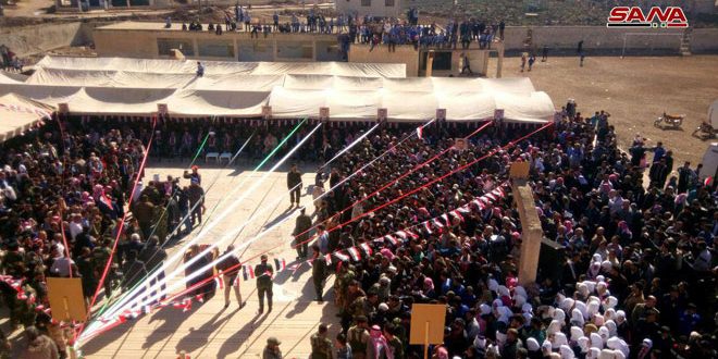 وأشارت الكلمات التي ألقيت من وحي انتصارات الجيش وتضحيات بواسله إلى أن الإرهاب المدعوم من كيانات وأنظمة ودول معادية للدولة السورية سقطت رهاناتهم جميعا أمام الثالوث الوطني الذي شكل رافعة للنصر وهو الجيش والشعب والقائد مثمنة صمود السوريين ووعيهم والتفافهم حول جيشهم العقائدي ما حقق الانتصار تلو الانتصار مؤكدين أن النصر المؤزر على الإرهاب وإعلان سورية خالية من رجسه بات قاب قوسين أو أدنى.