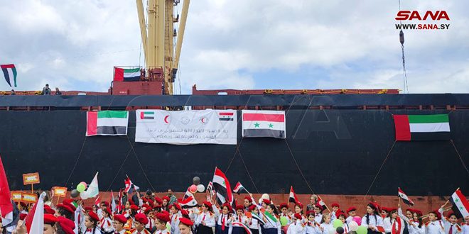 وصلت إلى ميناء اللاذقية اليوم سفينة مساعدات إماراتية، هي الثانية من نوعها، وعلى متنها 2215 طناً من المواد الغذائية والإغاثية المختلفة.