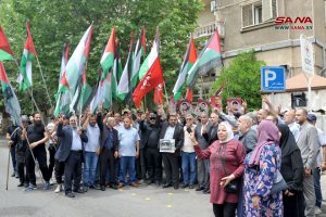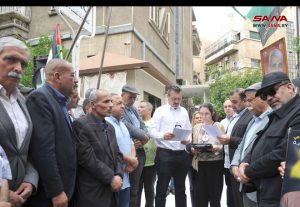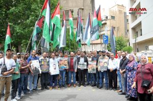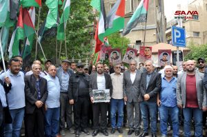 نظمت فصائل المقاومة الفلسطينية ولجان الدفاع عن الأسرى والمعتقلين الفلسطينيين في سجون الاحتلال الصهيوني اليوم وقفة احتجاجية اليوم أمام مقر بعثة اللجنة الدولية للصليب الأحمر بدمشق، تنديداً بالجرائم المرتكبة من قبل الاحتلال بحق الأسرى الفلسطينيين في سجونه، ونصرة ودعماً لصمودهم.