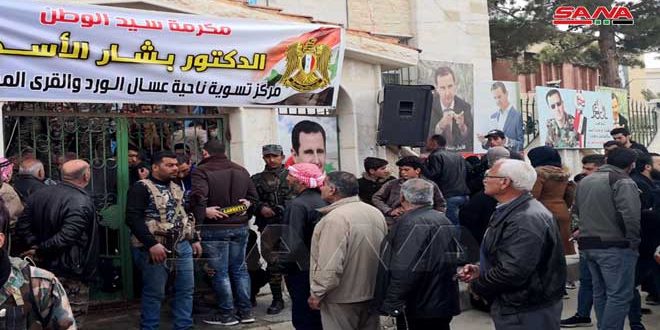 تلبية لرغبة الأهالي واصل مركز التسوية في بلدة عسال الورد بريف دمشق عمله لإتاحة الفرصة أمام جميع المشمولين بها من أبناء البلدة والقرى المحيطة بها وفق الاتفاق الذي طرحته الدولة والتي تستهدف المطلوبين من المدنيين والعسكريين الفارين والمتخلفين عن خدمتي العلم الإلزامية والاحتياطية.