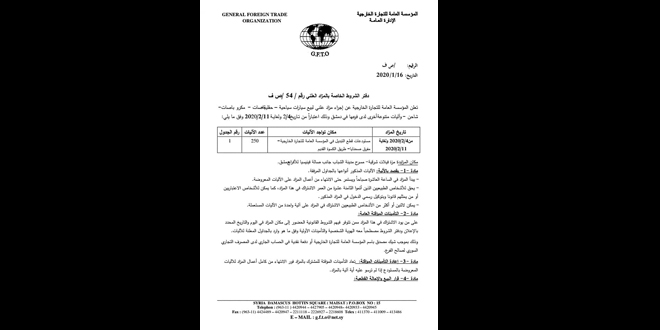 أعلنت المؤسسة العامة للتجارة الخارجية عن مزاد علني لبيع 250 سيارة لدى فرعها في دمشق بين الـ 4 والـ 11 من شباط القادم.