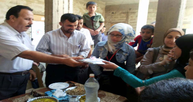 في إطار الدعم النفسي للمهجرين الذين تركوا بيوتهم جراء الاعتداءات الإرهابية وتخفيفا لمعاناتهم أقامت جمعية رعاية وتأهيل المكفوفين بدير الزور خلال زيارة متطوعي الجمعية لمركز الإقامة المؤقتة بجامع الفتح بمدينة دير الزور مسابقة في فن الطبخ للقاطنات بالمركز.