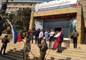 من جانبه شكر الدكتور نديم زحلوق مدير مشفى حلب الجامعي روسيا الاتحادية على الجهود المبذولة لمساعدة سورية في محنتها، معتبراً أن الدماء السورية امتزجت مع نظيرتها الروسية في مكافحة الإرهاب العالمي المتمثل بالولايات المتحدة الأمريكية وربيبتها “إسرائيل”.
