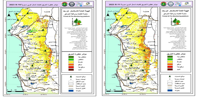 وأوضحت المنصة إلى أنه يتم إعداد الخرائط في الهيئة العامة للاستشعار عن بعد بالتعاون مع وزارة الزراعة والإصلاح الزراعي (مديرية الحراج) و المديرية العامة للأرصاد الجوية، داعية المواطنين إلى عدم إشعال أي نيران والإبلاغ عن أي نار أو دخان على الأرقام المجانية 188 و113.