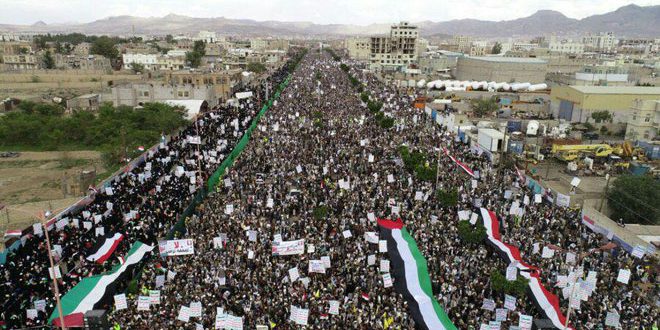 وذكر موقع المسيرة نت أن حشودا ضخمة من اليمنيين تجمعوا في الشوارع ورفعوا أعلام الجمهورية اليمنية والأعلام الفلسطينية ولافتات مناهضة للسياسة الأمريكية في المنطقة وأخرى تعبر عن تضامن الشعب اليمني مع الشعب الفلسطيني في استعادة حقوقه.