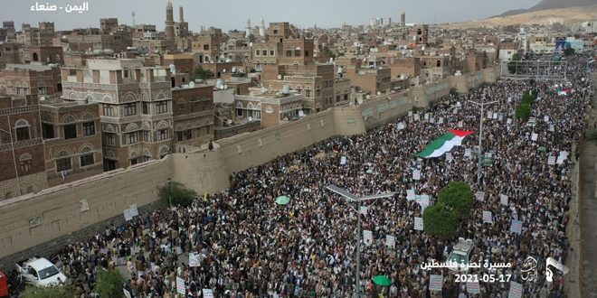 وذكر موقع المسيرة نت أن مسيرة جماهيرية حاشدة جرت في ساحة باب اليمن بالعاصمة صنعاء تضامناً مع الشعب الفلسطيني ومقاومته الباسلة حيث رفع المشاركون الشعارات المتضامنة مع القضية الفلسطينية والرافضة للاحتلال الإسرائيلي واعتداءاته بحق فلسطين أرضاً وشعباً ومقدسات مؤكدين أن القضية الفلسطينية كانت وستبقى القضية المركزية للأمة وأن التنازل عنها أو المتاجرة والمزايدة بها ليس في قاموس الأحرار من أبناء الأمة.
