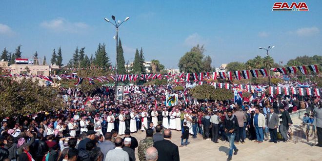 المشاركون الذين توافدوا من جميع قرى وبلدات ومدن المحافظة ساروا في مسيرة من البانوراما إلى ساحة 16 تشرين وسط مدينة درعا حاملين الإعلام الوطنية ورافعين صور السيد الرئيس بشار الأسد ولافتات تؤكد أهمية ذكرى الحركة التصحيحية التي قادها القائد المؤسس حافظ الأسد ورددوا هتافات وأهازيج من الفلكلور المحلي للمحافظة تغنت ببطولات الجيش وتضحيات الشهداء والجرحى.