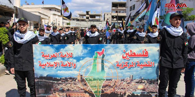 شهد مخيم النيرب في حلب اليوم مسيرة حاشدة، ضمن فعاليات يوم القدس العالمي، ندد المشاركون فيها بالاعتداءات والانتهاكات الإسرائيلية بحق القدس المحتلة، مشددين على حق الشعب الفلسطيني بأرضه ومقدساته.