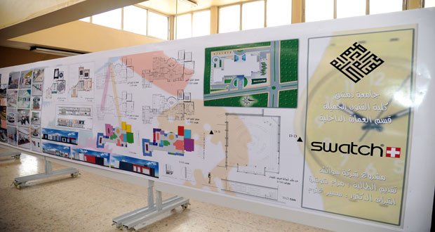 الطالبة مرام شوشرة من قسم العمارة الداخلية قدمت مشروعا عن تصميم مبنى لشركة ساعات عالمية يتضمن صالة عرض وطابقين للمكاتب الإدارية بطريقة حافظت من خلالها على الهوية البصرية للشركة وبتصاميم تعكس العصرية والروح العملية وتسهل الحالة الخدمية للزبائن والموظفين باستغلال مدروس لفضاء البناء من الداخل.