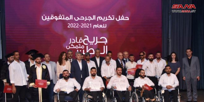 كرم مشروع جريح الوطن 16 جريحاً تفوقوا في الشهادتين الإعدادية والثانوية والمرحلة الجامعية للعام الدراسي 2021-2022، وذلك في المركز الثقافي العربي بطرطوس بحضور عدد كبير من الجرحى الناجحين في شهادتي التعليم الأساسي والثانوي المشاركين في مخيم الناجحين المقام في المحافظة.