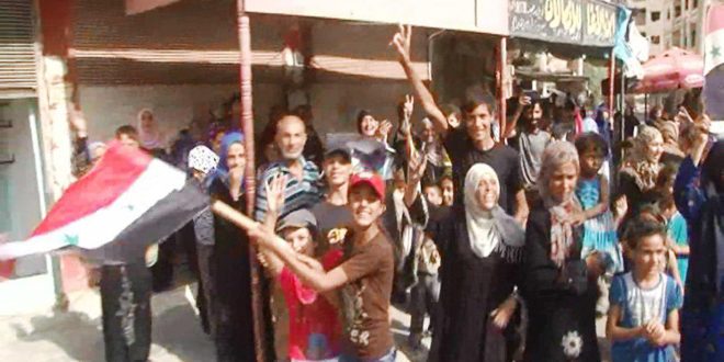 وذكر مراسل سانا أن المئات من الأهالي احتشدوا في الأحياء الغربية والشرقية من المدينة رافعين صور السيد الرئيس بشار الأسد والأعلام الوطنية وهتفوا تحية للجيش العربي السوري حامي الديار.