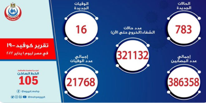 سجلت وزارة الصحة والسكان المصرية 16 حالة وفاة و783 حالة إصابة جديدة بفيروس كورونا المستجد خلال الساعات الأربع وعشرين الماضية.