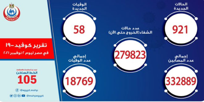 سجلت وزارة الصحة والسكان المصرية 58 حالة وفاة و 921 إصابة جديدة بفيروس كورونا خلال الساعات الأربع والعشرين الماضية.