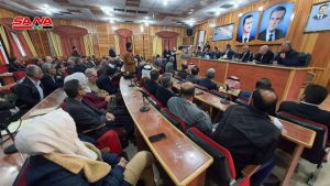 ودعا الحضور إلى تأجيل دفع الأقساط المالية تجاه ديون المصارف الزراعية وتمويل الفلاحين بالقروض المالية الخاصة بالزراعة والتحول إلى الطاقة البديلة والعمل على توفير مواد المقنن العلفي الخاصة بمربي الثروة الحيوانية وزيادة الكميات المخصصة التي يتم توزيعها عبر الدورات العلفية التي يتم افتتاحها من قبل فرع مؤسسة الأعلاف إضافة إلى تأمين اللقاح البيطري الخاص بتحصين مختلف صنوف الثروة الحيوانية وإعفاء الفلاحين من إيجار أراضي أملاك الدولة والعمل على توزيعها على الفلاحين والمطالبة بإحداث صندوق لتعويض الأضرار الزراعية الناتجة عن الأعمال الإرهابية.
