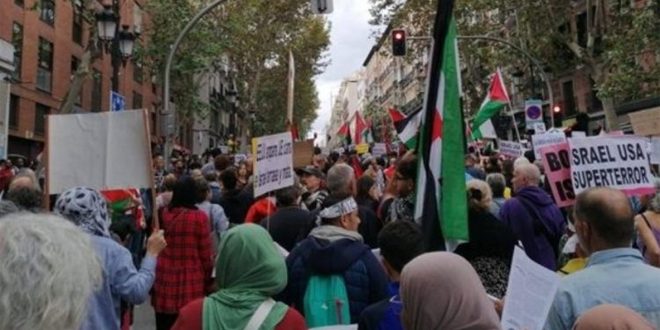 وفي العاصمة الإسبانية مدريد خرجت مظاهرة شارك فيها أكثر من 35 ألف شخص بدعوة من منظمة “التضامن مع فلسطين” دعماً للشعب الفلسطيني.