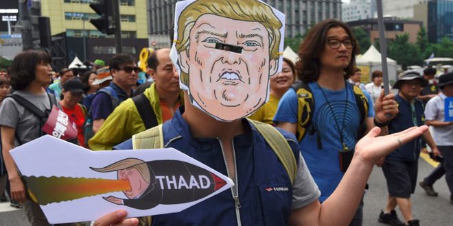 تظاهر آلاف الأشخاص اليوم قرب السفارة الأميركية في سيئول احتجاجا على ما وصفوه “اجبار” الرئيس الأميركي دونالد ترامب كوريا الجنوبية على نصب الدرع الصاروخية الأميركية “ثاد” في بلادهم.