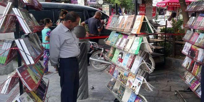 عناوين متنوعة لكتب تاريخية وأدبية وعلمية ضمها المعرض المقام حاليا في الهواء الطلق عند مدخل شارع الخضر في مدينة جرمانا.