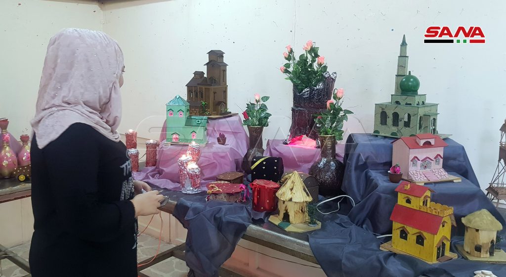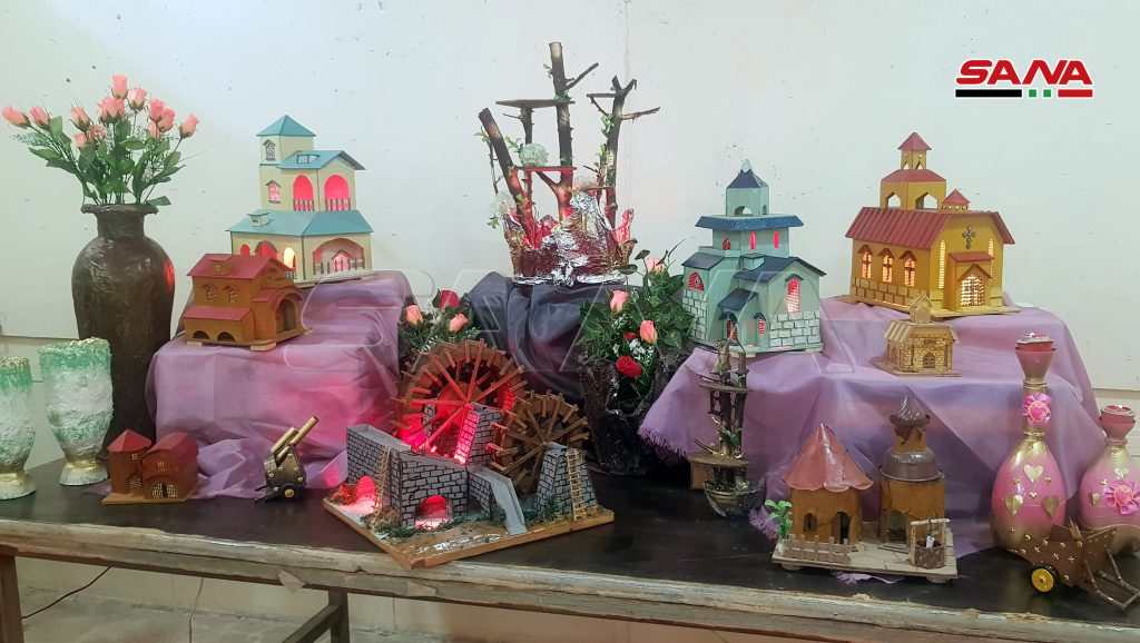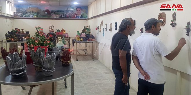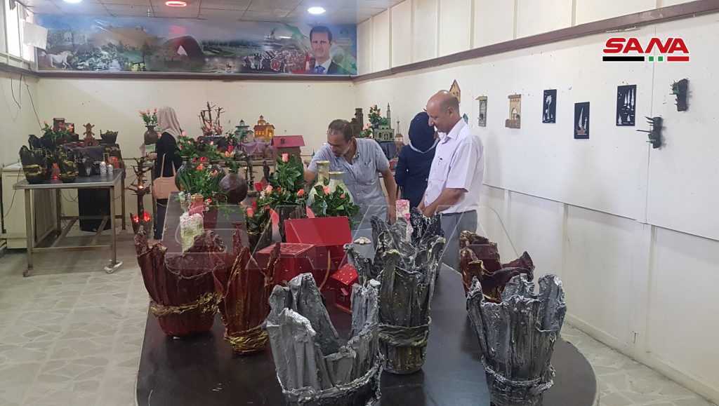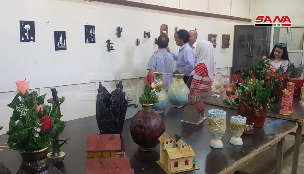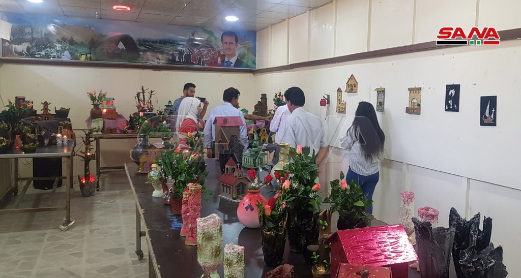 المعرض الذي نظمته مديريتا الثقافة والبيئة بالتعاون مع جمعية سورية اليمامة الخيرية تنوعت معروضاته ما بين المجسمات ولوحات الزينة والتشكيل الفني والورود المصنوعة من مخلفات البيئة كالورق المقوى والأخشاب.