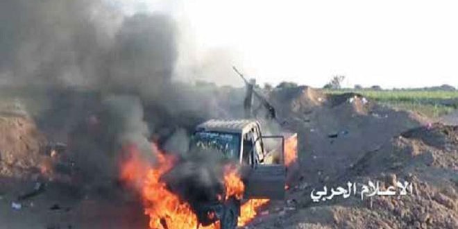 في سياق آخر تمكنت وحدة الهندسة التابعة للجيش واللجان الشعبية من تدمير آلية عسكرية محملة بمرتزقة العدوان السعودي بعبوة ناسفة في صحراء الأجاشر قبالة نجران.