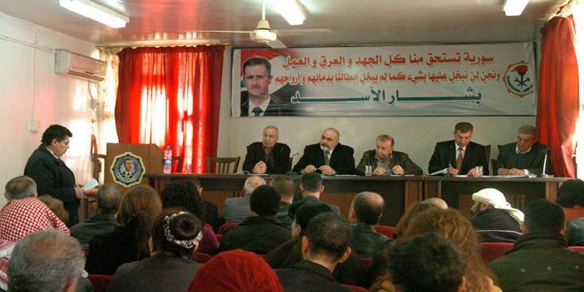 ونوه عضو قيادة فرع السويداء لحزب البعث العربي الاشتراكي رئيس مكتب العمال والاقتصاد الفرعي حسن الأطرش بجهود الطبقة العاملة في ظل الظروف الراهنة لجهة الاستمرار بالعمل والإنتاج بما يعزز مقومات الصمود.