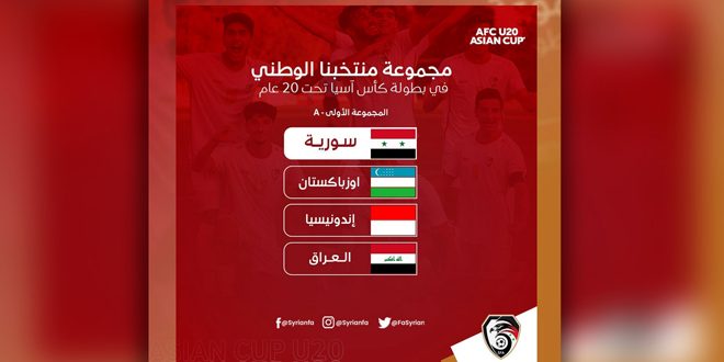 أوقعت قرعة نهائيات كأس آسيا للشباب تحت 20 سنة التي سحبت في العاصمة الأوزبكية طشقند منتخب سورية لكرة القدم في المجموعة الأولى، إلى جانب منتخبات أوزبكستان وأندونيسيا والعراق.
