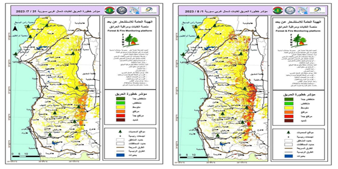 وأوضحت المنصة أنه يتم إعداد الخرائط في الهيئة العامة للاستشعار عن بعد بالتعاون مع وزارة الزراعة والإصلاح الزراعي مديرية الحراج والمديرية العامة للأرصاد الجوية، داعية جميع المواطنين إلى عدم إشعال أي نيران والإبلاغ عن أي نار أو دخان على الأرقام المجانية 188 و113.