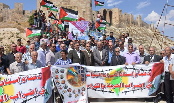 تضامناً مع الأسرى السوريين والفلسطينيين الصامدين في سجون الاحتلال الإسرائيلي والمضربين عن الطعام ليومهم الأربعين نفذت شعبة الشهيد تيسير الحلبي لحزب البعث العربي الاشتراكي وفصائل تحالف القوى الفلسطينية وقفة تضامنية أمام قلعة حلب .