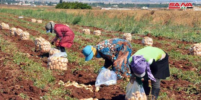 جني محصول موسم البطاطا الربيعية في منطقة قطينة بريف حمص الجنوبي الغربي