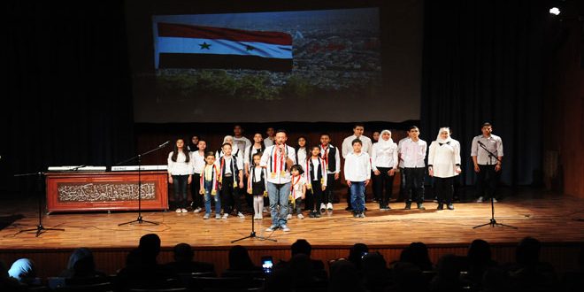 وقدم أطفال وشباب نادي إبداعات عرضا غنائيا بعنوان “أنشودة الانتصار” أدوا خلالها أغنية “راياتك مرفوعة يا بلدي” على ذات لحن قصيدة “يا شام” للفنان صفوان بهلوان ثم قروءوا حواريات فردية مستلهمة من واقع الحرب على سورية قبل أن يختموا عرضهم بأغنية “خبطة قدمكم”.