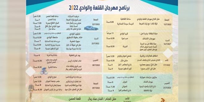 وتستقبل بلدات وقرى الوادي القلاطية وحب نمرة والمزينة ومرمريتا وكفرا والحواش والحصن والناصرة وعناز والمشتاية بكنائسها وأديرتها ومراكزها الثقافية وجامعتها ومدارسها وساحاتها ومطاعمها وملاعبها الرياضية فعاليات المهرجان الذي يستمر لمدة اسبوعين اعتباراً من الخامس عشر وحتى نهاية الشهر الجاري.