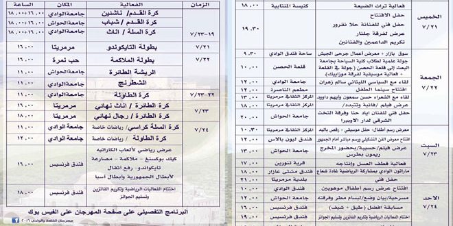 وتقام جميع هذه الفعاليات التي تبدأ منذ التاسعة والنصف صباحاً في بلدة الحواش وفي ساحة فندق الوادي وقلعة الحصن وجامعة الوادي ومطعم الناصرة والمركز الثقافي في مرمريتا وقرية تنورين وفندق مشتى عازار وبلدية مرمريتا وفندق فرنسيس.