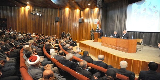 من جانبه أكد الدكتور طلال ناجي الأمين العام المساعد للجبهة الشعبية لتحرير فلسطين القيادة العامة في كلمته أن “العدوان على فلسطين عدوان على سورية ودونها لا أمل بتحرير فلسطين” معتبرا “أن سورية اليوم تدفع ثمن مواقفها التاريخية من فلسطين والتزامها القومي بقضايا الأمة العربية” .