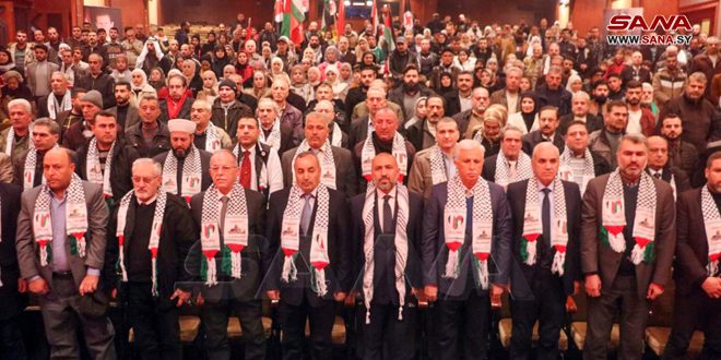وألقى كلمة أحزاب الجبهة الوطنية التقدمية عضو قيادة فرع حلب لحزب البعث العربي الاشتراكي عماد غضبان، وأكد فيها أن بطولات أبناء الشعب الفلسطيني والانتصارات التي سطرتها المقاومة في عملية طوفان الأقصى أذلت العدو الاسرائيلي الذي يرتكب المجازر الوحشية بحق المحاصرين والمدنيين في غزة، لافتاً إلى أن سورية كانت وما زالت تعتبر فلسطين قضيتها المركزية، وتقدم كل الدعم لأبناء الشعب الفلسطيني وتقف معهم في صمودهم ضد المحتل الاسرائيلي.