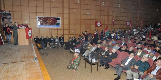 وأكد ممثل الحزب في سورية “مصطفى الهرش” التصميم على مواصلة النضال مع أبناء الشعب الفلسطيني لتحرير فلسطين وإقامة الدولة الفلسطينية المستقلة وعاصمتها القدس وضمان حق العودة مبيناً ضرورة العمل على توفير الحماية الوطنية للانتفاضة الشبابية الفلسطينية وتحويلها إلى انتفاضة شعبية تتسلح ببرنامج المقاومة الموحد وإنهاء حالة الانقسام وتحقيق المصالحة الوطنية.