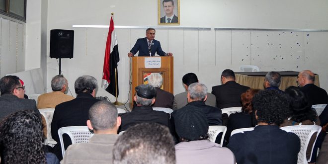أما الشاعر ثائر إبراهيم فألقى عدداً من قصائده الوطنية التي تمجد النضال ضد الغزاة وتتحدى الإرهاب والمؤامرة التي تتعرض إليها سورية بأساليب وأشكال شعرية مختلفة غلبت عليها العاطفة الوطنية والتدفق الحماسي فقال في قصيدة “فدائي”: “لزيتونة شاخ زيت صباها.. وشابت جدائلها في الصقيع.. لمريم تخبز جوع اليتامى.. وتعطي المسيح.. لأم تزين موت فتاها بشال الرجوع.. وتغزل آخر لابن رضيع.. أقول دمي سوف يزهر فجراً.. وقلبي سيورق ذات ربيع”.