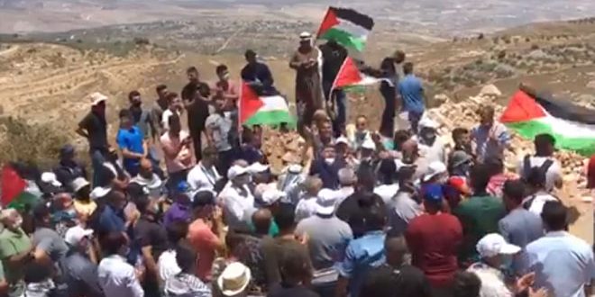 وتجمع المشاركون في المظاهرة للأسبوع الثالث على التوالي فوق قمة جبل عيبال الذي تهدد سلطات الاحتلال بالاستيلاء عليه لتوسيع عمليات الاستيطان ورفعوا الأعلام الفلسطينية مرددين هتافات تندد باعتداءات قوات الاحتلال والمستوطنين المتواصلة على الفلسطينيين وممتلكاتهم ونهب أراضيهم مشددين على رفض مخططات الاحتلال ضم أراض من الضفة الغربية وعلى مواصلة النضال دفاعاً عن الأرض والحقوق.