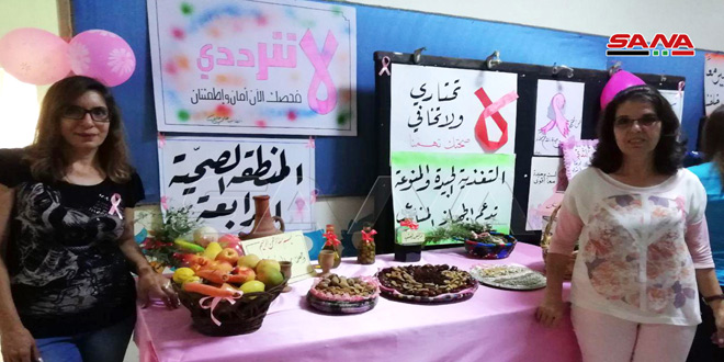 وداد حسن مسؤولة برنامج الصحة الإنجابية في المنطقة الصحية الرابعة أشارت إلى أنه تم التحضير للمعرض الذي بدأت فعالياته الاثنين واختتمت اليوم وشاركت فيه ناجيات من سرطان الثدي ومثقفات صحيات ومتطوعات وضم مجسمات فنية من توالف البيئة توضح عوامل الوقاية من المرض وأشغالا يدوية تؤكد ضرورة مقاومة المرض.