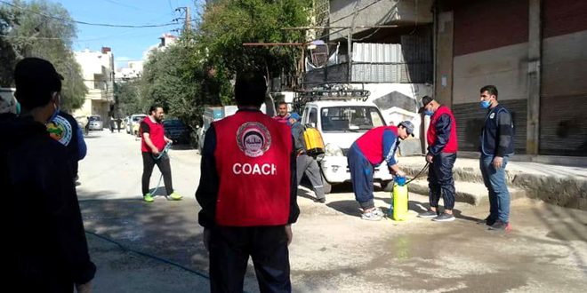 في إطار الإجراءات الاحترازية للتصدي لفيروس كورونا المستجد حفاظاً على سلامة المواطنين نفذ نادي دمر الرياضي حملة تعقيم احترازية تم خلالها تنظيف وغسيل وتعقيم الشوارع والمنشآت في منطقتي دمر الغربية والشرقية.