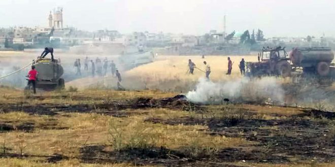 أدى انفجار عبوة من مخلفات الإرهابيين في السهول المجاورة لمعبر نصيب الحدودي بريف درعا إلى اندلاع حريق أتى على عدد من أشجار الزيتون وحقل للشعير.