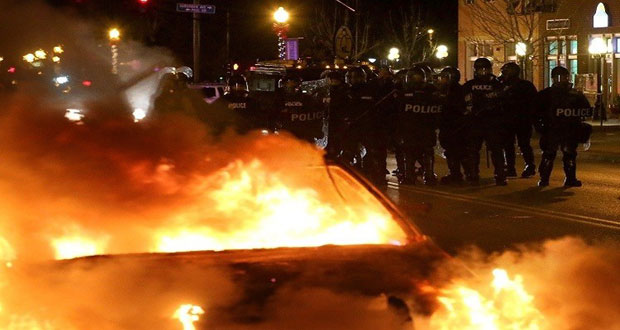 وذكرت وكالة الصحافة الفرنسية أن مدينة فرغسون الامريكية عاشت ليلة ثانية من الاضطرابات والاحتجاجات على الحكم القضائي الجائر بحق الشرطي الامريكي القاتل حيث أحرق محتجون في سانت لويس سيارة للشرطة فيما انتشر شرطيون بلباس مكافحة الشغب في أماكن متفرقة من المدينة الصغيرة التي ألهب الشارع الأمريكي احتجاجا على الاحكام العنصرية للقضاء الامريكي.